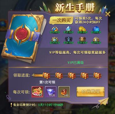 新生手册购买后可领取5次,每次获得精美道具奖励并获得持续24小时的buff加成。