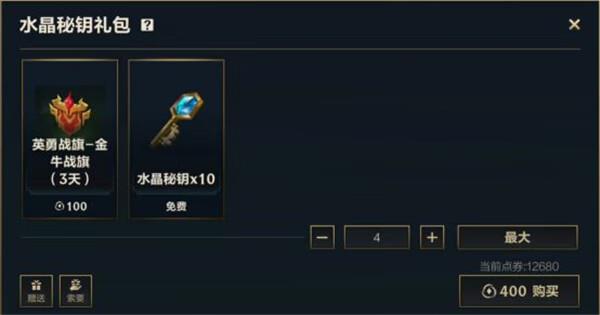 召唤师可以参与免费活动、大型庆典、后续将会推出的更多形式的游戏内活动或购买100点券的水晶密钥礼包(购买金牛战旗3天+免费赠送10个水晶秘钥),获得免费的水晶秘钥,使用水晶秘钥,开启战利品宝箱,获取战利品宝箱奖励。