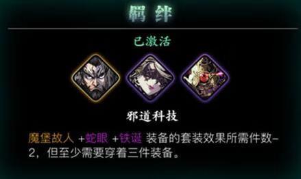 核心功能:全部做到紫1火后携带在技能链中,装备的套装效果所需件数-2,但至少需要穿着3件装备,目前该羁绊是影之刃3手游中最为核心的,减少了套装的需求后,才可以丰富装备的搭配。