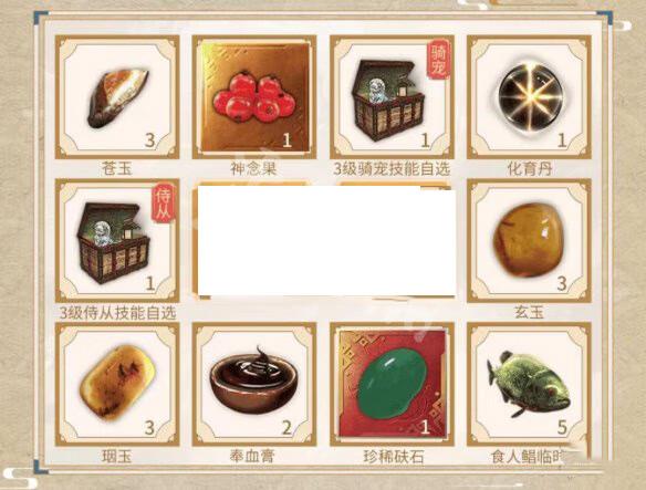 还有【3级骑宠技能自选包】【3级侍从技能自选包】【化育丹】【食人鲳·临时】帮大家培养宠物、喂养鱼苗。