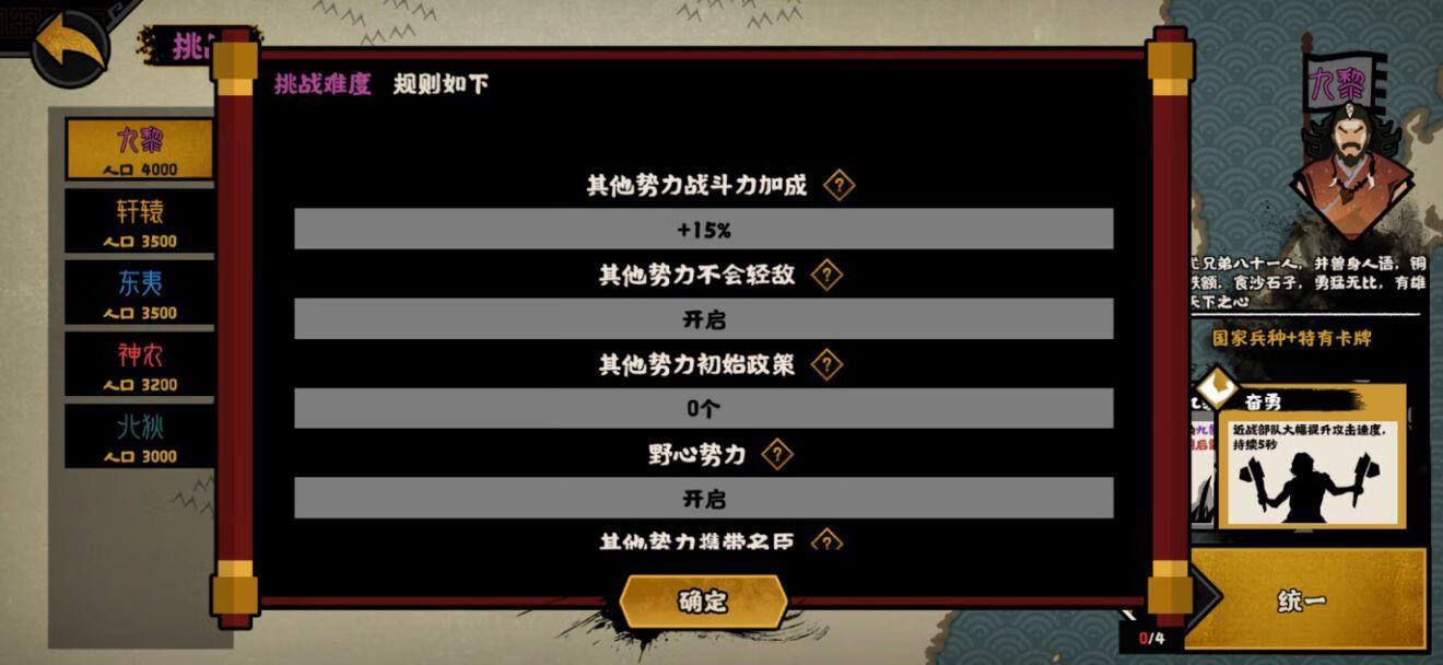 2、春秋战国及之后时代的剧本直接解锁困难难度,3星解锁挑战和自定义难度;