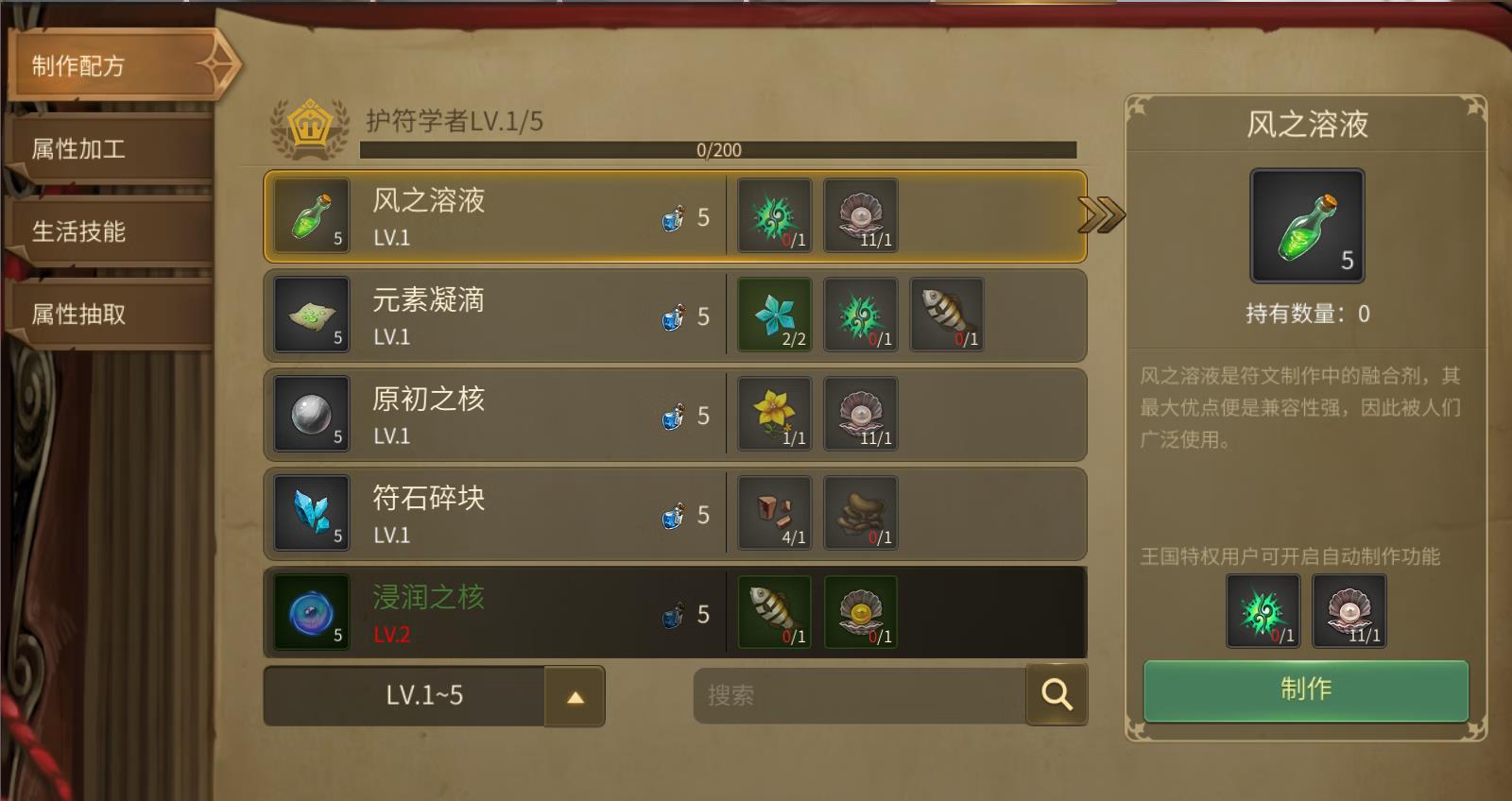 在制作配方里,你可以看到各种材料的介绍、所在地以及采集它需要的职业等级。你可以将采集到的材料合成其他物品。