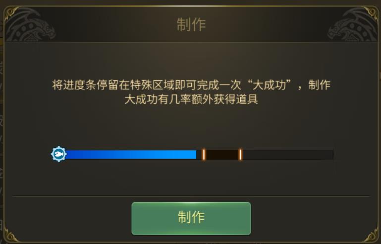 将进度条停留在特殊区域即可完成一次“大成功”,制作大成功有几率额外获得道具。即便未达成“大成功”,也可以获得本次制作的产物。