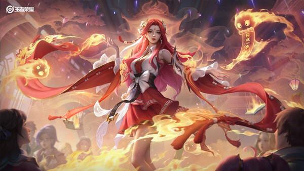 三技能: 开启时飞舞的火绸带,凸显瞬间的张力,召唤炎之精灵在中间作为法阵能量源,不断为大招法阵提供能量,火灵俏皮生动;