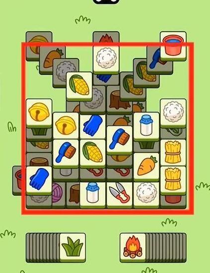 1、游戏开始后,千万不要急着去三消。我们要做的是从主牌区和副牌区内各选出一张相同的牌。这张被选的牌在主牌区内必须是第一层里面独一无二的牌。我们应该选择主牌区里仅有的手套,而不是水桶,如下图。