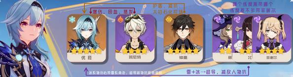 盾辅位置也可把钟离替换成迪奥娜,提供回血护盾,以及配合优菈提供双冰共鸣,并为优菈提供能量回复。