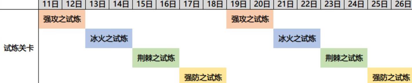试炼关卡为本次新增的系列活动副本,但并不是在同一天投放,而是以两天为一个周期进行循环。共持续两周时间,具体规划如下: