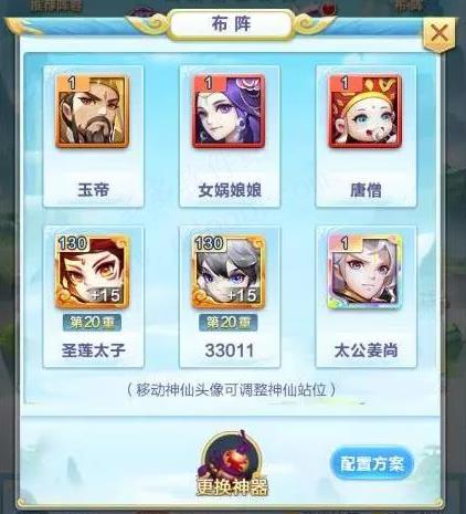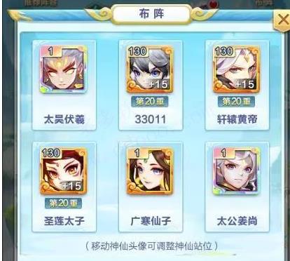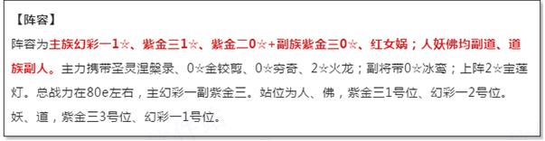 2、95级子牙、太子、玉帝、红唐僧、红女娲、主角变红唐僧。1☆貔貅、0☆火龙、0☆宝莲灯、0☆紫金元神、元始天书。站位如下图所示。