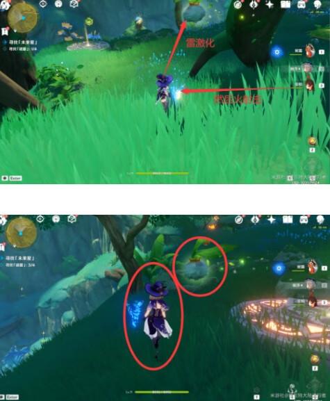 5.另外2个火炬树桩需要使用雷元素激化移动的三乘种子,使火炬树桩显形,再用火元素角色点燃就行。