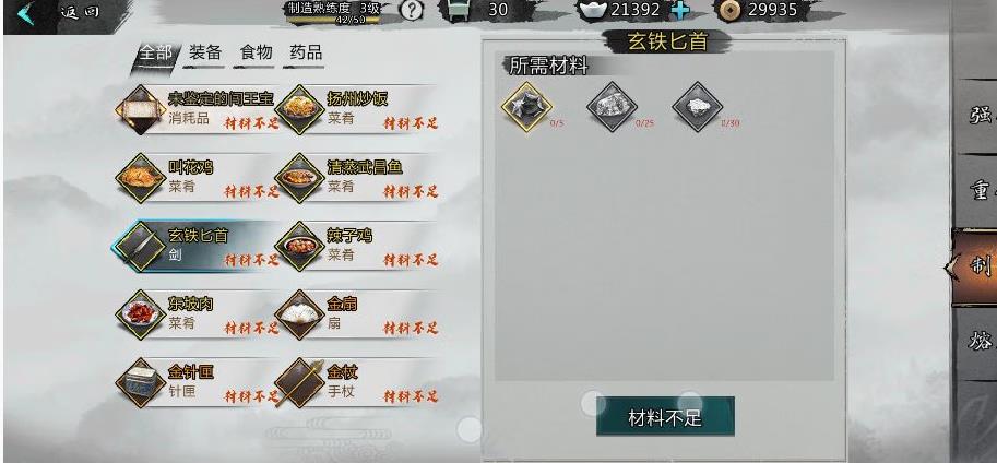 游戏里还有生产系统,进入生产界面,可以看到我收集的配方,点击配方就可以看到需要的材料清单,这里也会需要相应的材料来进行生产: