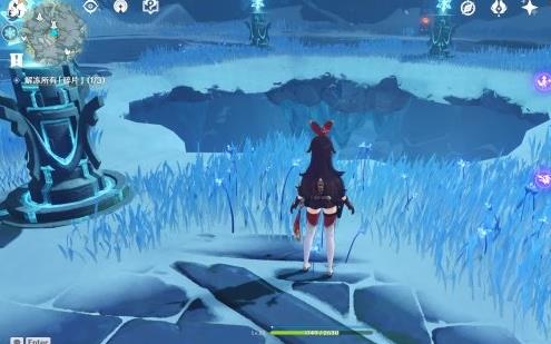来到遗迹后,开关上方会有一个仙灵,按下开关,玩家按照仙灵指示的顺序点亮冰柱即可开启。