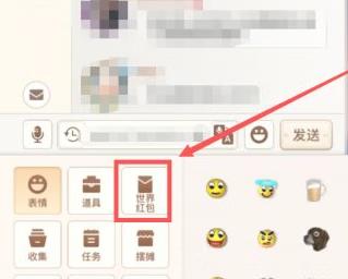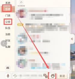 2.弹出频道面板后,选择【世界频道】或者【公会频道】,并点击底部对话框旁边的表情图标