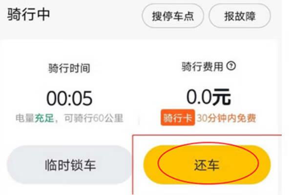 3、在“骑行中”页面点击还车。