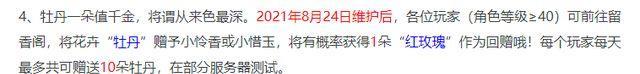 另外,据悉此次维护之后,系统对于牡丹的作用再次进行了提升,玩家可以用赠送的方式在小怜香或小惜玉处进行处理,有几率会获得玫瑰的奖励。今后牡丹花的价格或许还能再上涨一些吧?