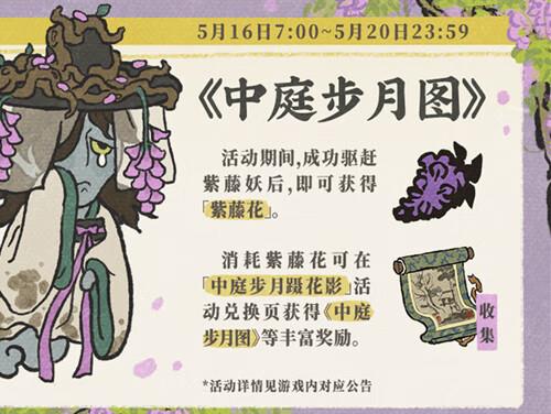 消耗紫藤花可在中庭步月蹑花影活动兑换也获得中庭步月图等丰富奖励。