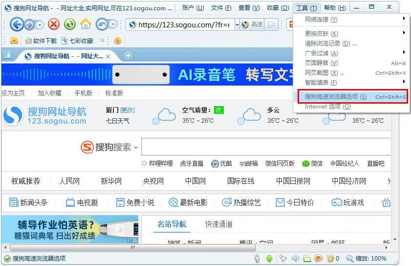 2、点击工具栏下面的“搜狗高速浏览器选项”。