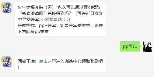 今天的跑跑卡丁车手游的微信每日一问的问题答案分享来啦!今天的问题是:金牛纳福套装(男)*永久可以通过预约领取“新春邀请函”兑换得到吗?想必很多玩家还不知道这个问题的答案是什么。下面小小编小编为大家带来正确的答案分享,希望可以帮助到大家!