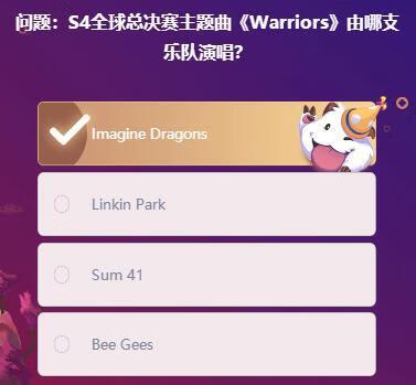 “S4全球总决赛主题曲《Warriors》由哪支乐队演唱?”,这是明星挑战赛中的进入问题之一,你们是不是还不知道正确答案呢?下面小小编小编为大家带来问题的答案分享,感兴趣的小伙伴快随小小编小编一起来看看吧!
