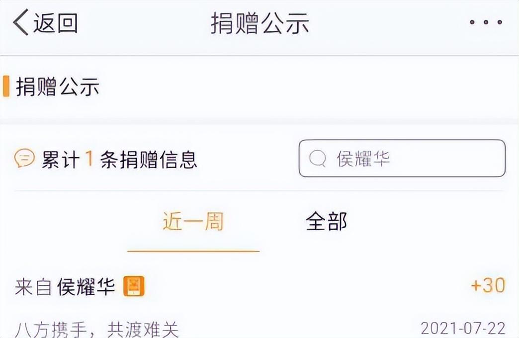 一位网友公示了侯耀华的捐款记录,数额为30元。