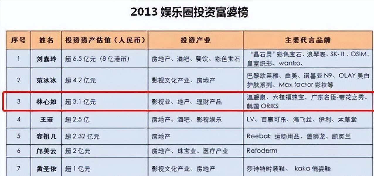 2013年,有媒体统计出娱乐圈投资富婆榜,林心如仅投资一项就高达3.1亿元。