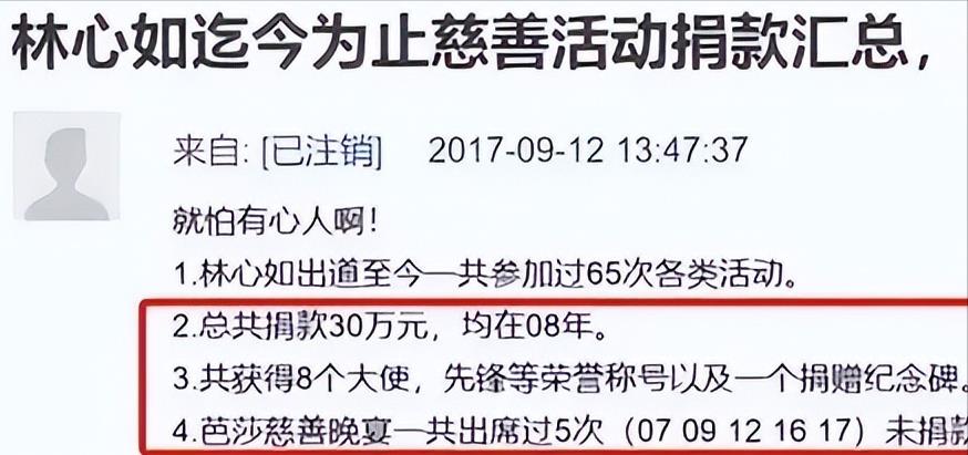 据某位网友爆料,林心如一共参加了65次慈善相关活动,分次捐了30万,还是只在08年一年,并且靠着30万获得了8个大使,各种荣誉称号和捐赠纪念碑。