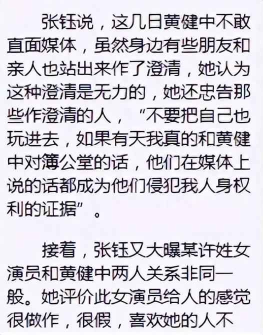 她表示:现在黄健中根本就不敢来直面媒体,即使他身边有人出来澄清,但这些对她而言是无力没用的。随后,张钰又说道:圈内还有一位许姓女明星,她与黄健中的关系十分暧昧。
