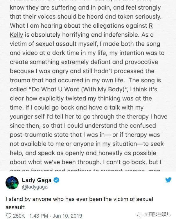 1月10日,著名歌手Lady Gaga在推特上发布了一篇诚恳的长文,