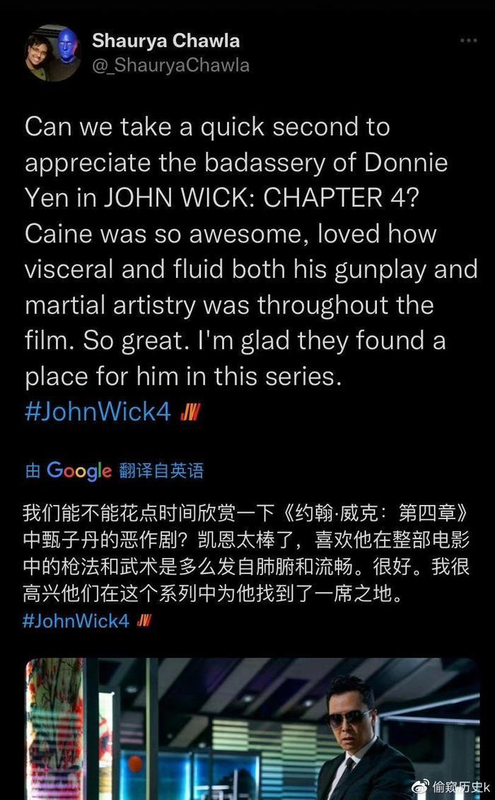 《极速追杀4》上映三周,全球累计票房超3亿美元,势头强劲。首周末票房出炉后,发行公司狮门影业还在推特账号上单独发了甄子丹的剧照,可见其重视程度。