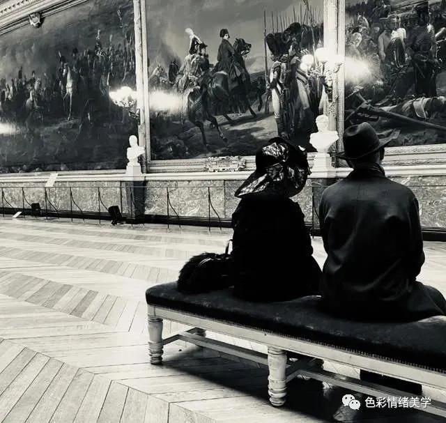 两人坐在长椅上时看壁画,背影看起来十分温馨。
