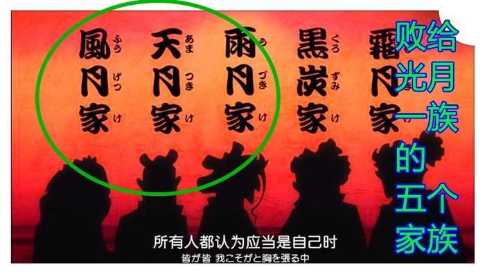 5个大名一族,分别有黑炭大蛇所在的黑炭家,霜月康家和霜月耕四郎所在的霜家一族,还有其他三个神秘的大名,雨月一族,风月一族,天月一族,这些大名最后在继承较量中都败给了光月一族。