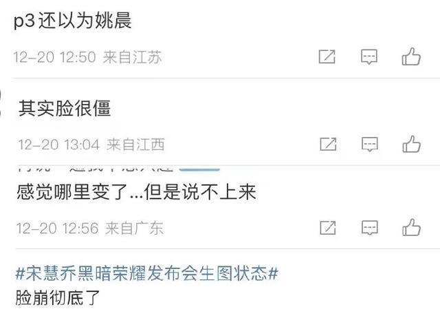 在整场活动中,宋慧乔本人表情很少,即便是展现笑容时,也有种面部僵硬的视觉感,仿佛是刚刚做完某种微调。网友纷纷叹息美人迟暮,更指乔妹已经出现医美后遗症,甚至变脸其他女星,比如姚晨,还有韩星柳智敏。