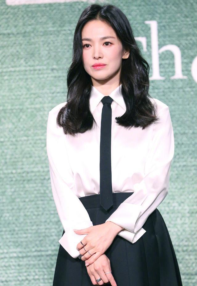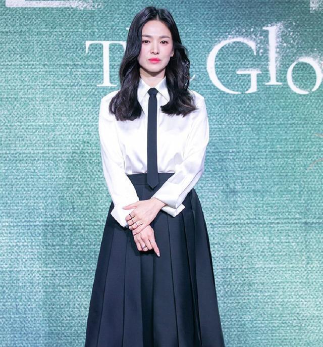 先看看韩娱女神宋慧乔的现场状态吧。在当地媒体的生图中,宋慧乔一身黑白撞色套装,衬衫领带搭配A版长裙,整体款式尽显大气干练的氛围,但由于黑白色调过于素净,增强了乔妹的气场,却让她看起来很显老气。