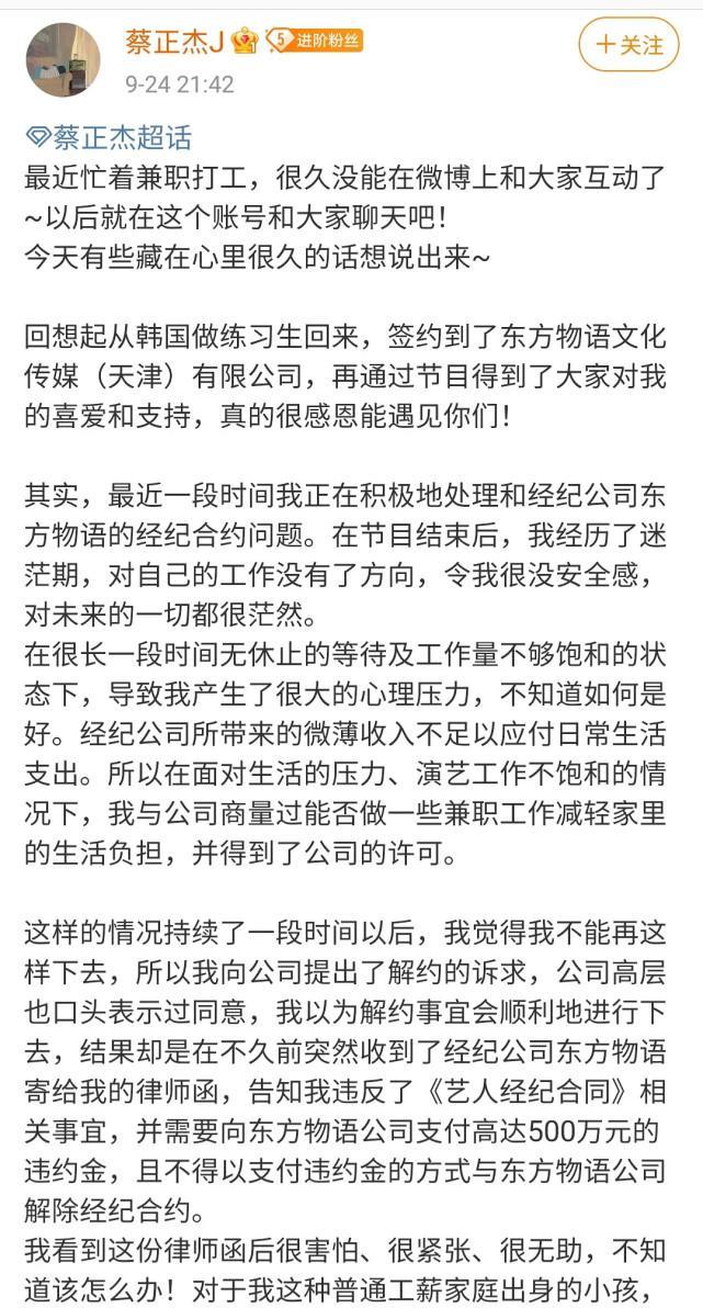 9月24日晚,蔡正杰发微博向粉丝汇报了自己的近况,还透露自己收到了经纪公司的律师函,而且公司向自己索赔500万的违约金。