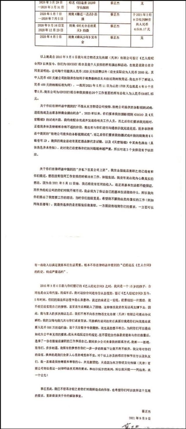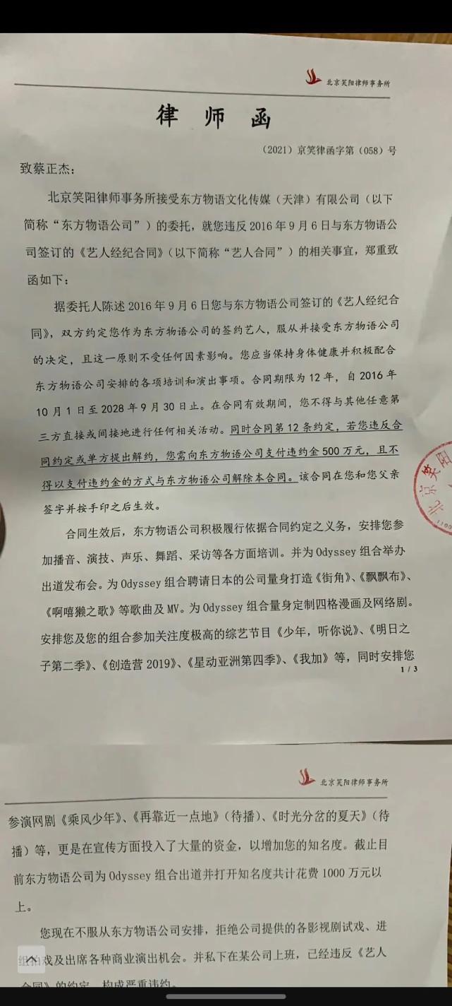 本以为解约之后能找份工作过普通人的生活,谁料却收到了公司的律师函。而且律师函中还写到蔡正杰违反了《艺人经纪合同》,需要向公司赔付高达500万的违约金。