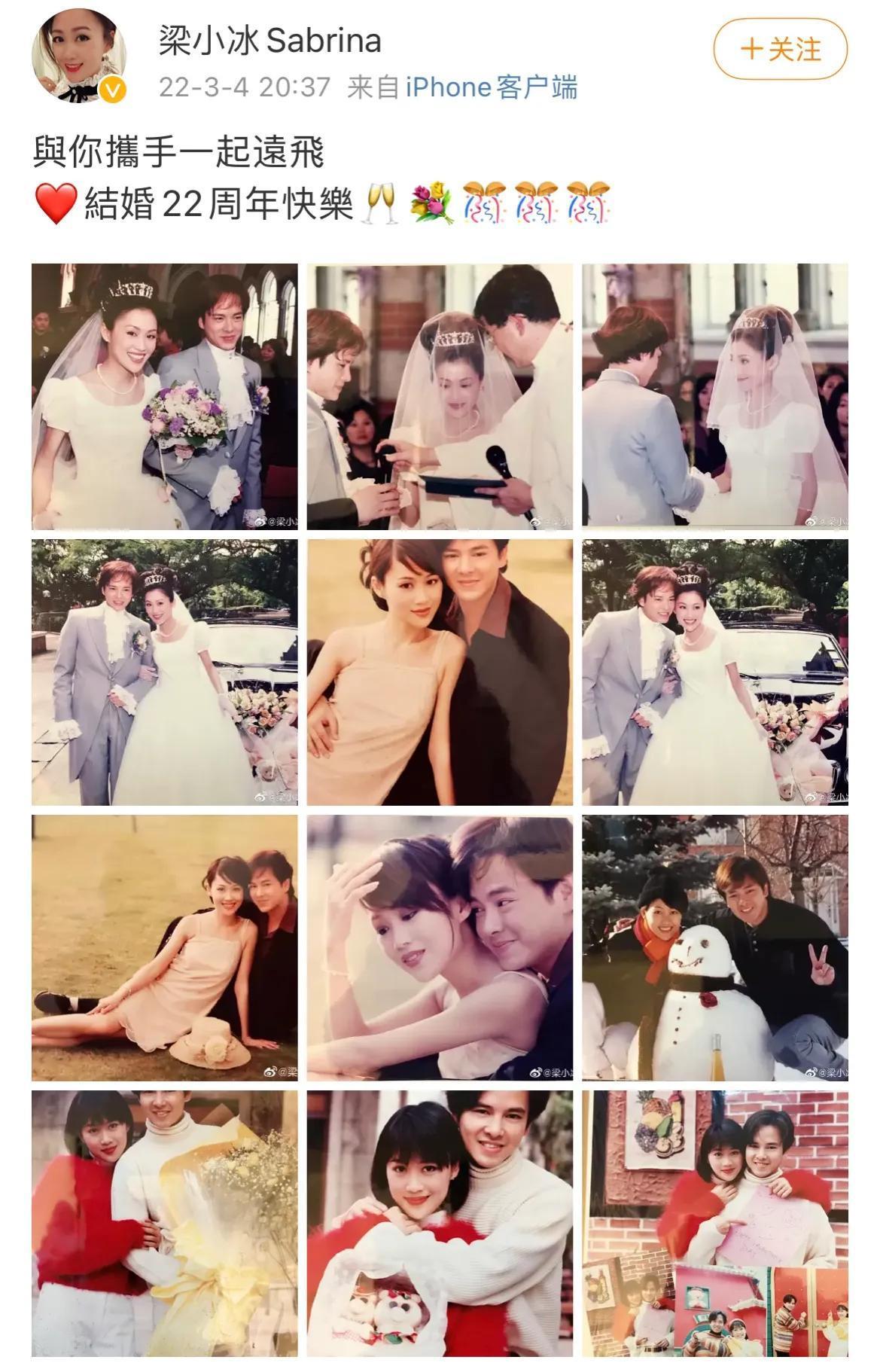 3月4日恰逢两人结婚22周年,梁小冰晒出12张照片展现他们恩爱幸福的瞬间以及当年婚礼的照片。