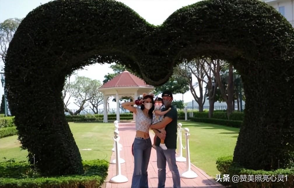 随后他们来到一个心形绿植下面拍照合影,张馨月头戴毛绒头饰,并摆出剪刀手的pos,老公林峯担心帽檐碰到女儿,反戴鸭舌帽,紧抱女儿,整体画面十分幸福、温馨。