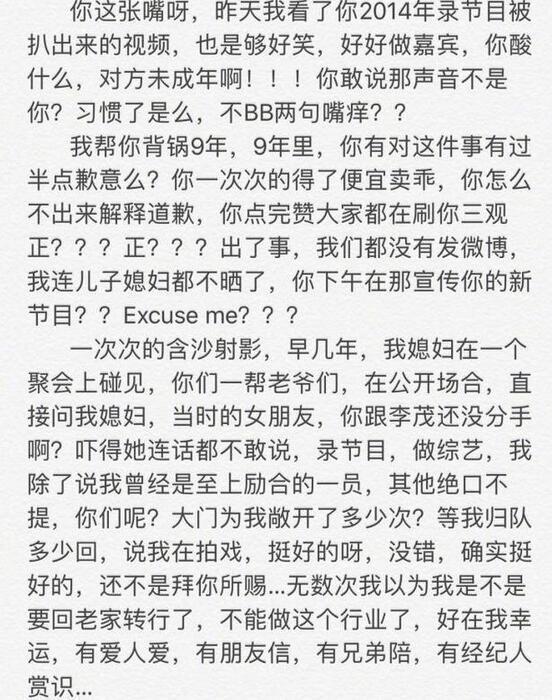 同时李茂老婆弦子下场亲自撕逼写作文了。弦子是一位女歌手,当年与潘玮柏合作的《不得不爱》红极一时。弦子在微博中力挺老公,证实当时李茂退出至上励合并非自愿,因退队一事消沉了很久。