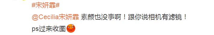 宋妍霏似乎是不相信自己长相和相机里面一样,让狗仔拍下素颜照片,证明自己的颜值和手机相机里面的画面是一样的。狗仔却表示手机相机是有滤镜的,喊话让宋妍霏过来收图看看真实的自己。