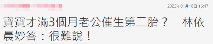 1月18日,有台媒报道,刚生完一胎女儿的林依晨疑似遭老公林于超催生二胎,引发网友热议。