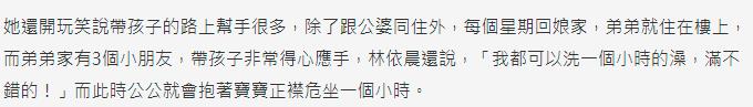 在老公隔离期间,一直都是林依晨带孩子,好在她和公公婆婆住在一起,有人帮忙轻松很多。并且林依晨每个星期都会带着女儿回娘家,弟弟也会帮她带孩子,给她减轻了不少负担。