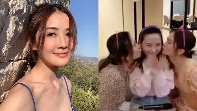 视频中,阿Sa头戴粉红色发箍,身穿橙色连衣裙,与另一位女性对生日主角石佩蓝两面夹击亲吻其脸颊。
