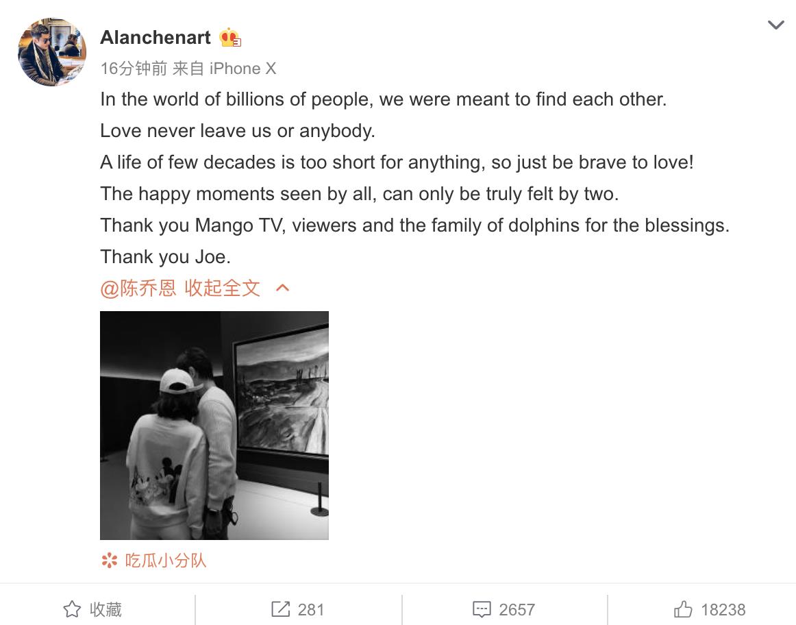 12月2日上午,陈乔恩与曾伟昌先后通过社交账号官宣了恋情。