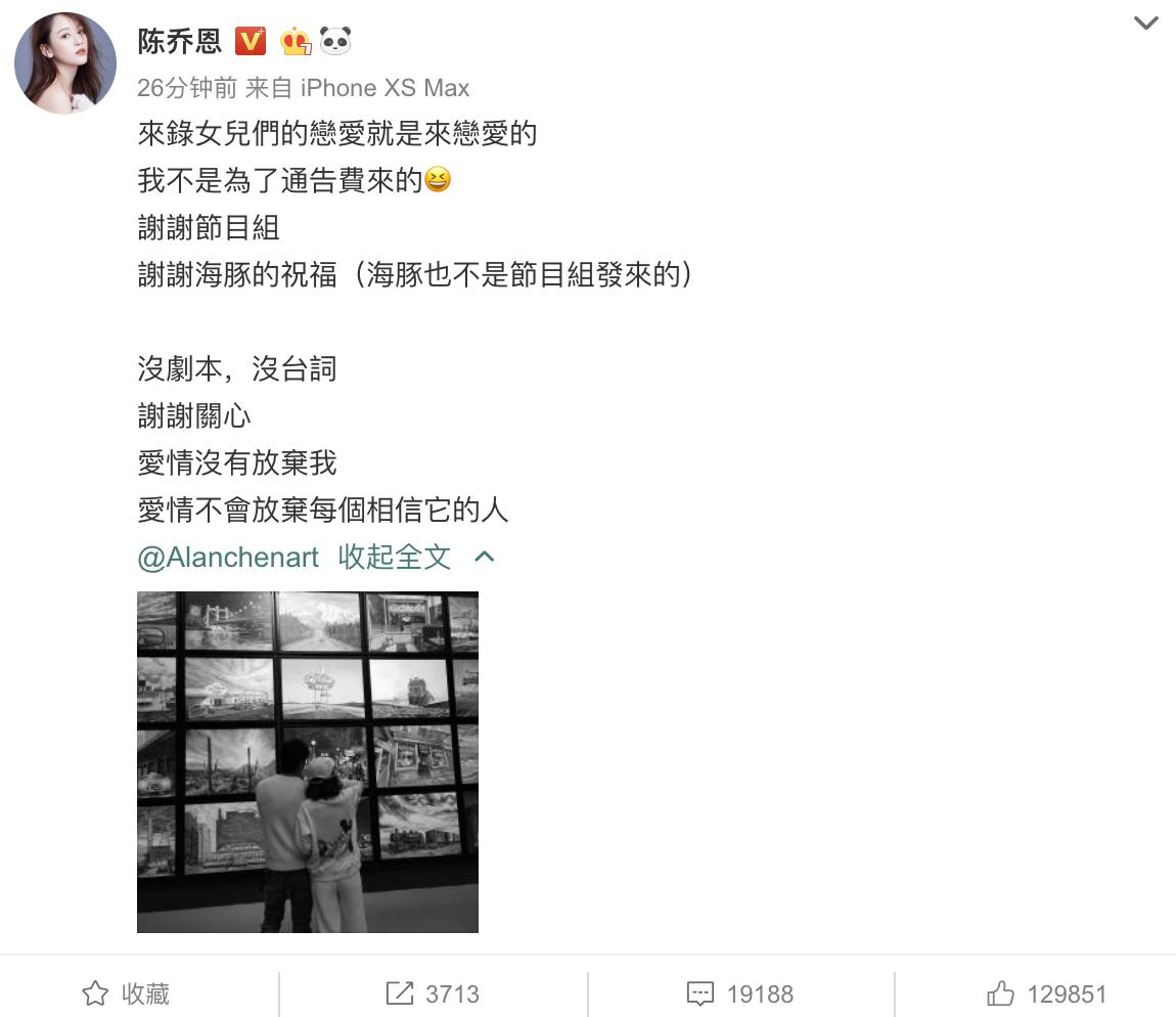 陈乔恩表示:没有剧本、没有台词,爱情没有放弃我,爱情不会放弃每一个相信它的人。
