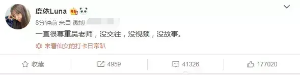 近日,网传吴亦凡疑似与秦牛正威恋爱,又接连曝出聊天视频。31日下午,鹿依Luna微博发文称“一直很尊重吴老师,没交往,没视频,没故事。”否认和吴亦凡交往。