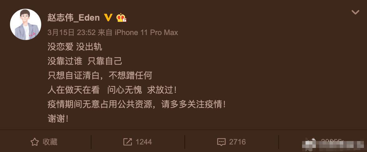 虞书欣只要有任何动静都会上热搜,而青年演员赵志伟在15日深夜发文“没恋爱,没出轨,没靠过谁,只靠自己”,以此来回应他和虞书欣的恋爱绯闻。