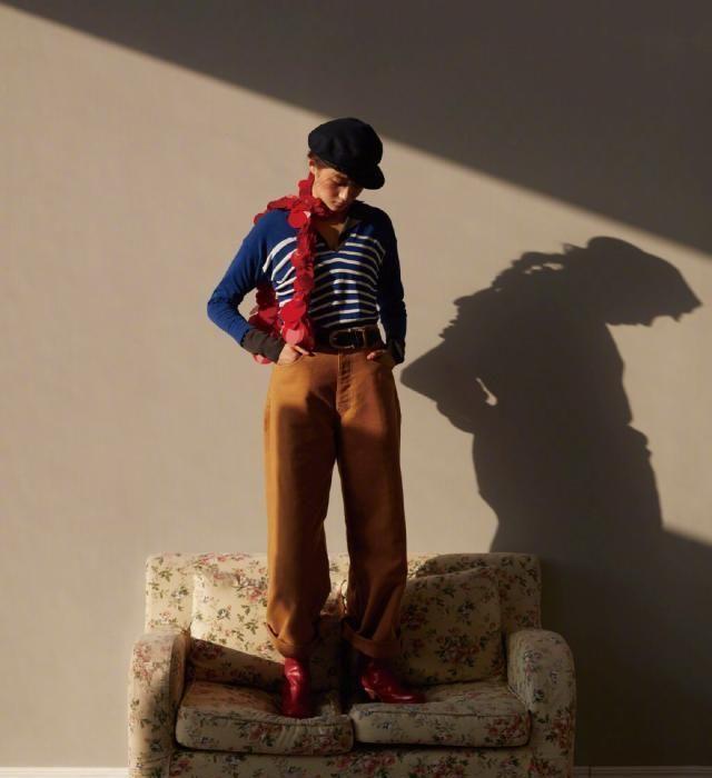 蓝色和白色条纹的上衣表现出随意的风格,更好地表现了身体曲线和身材特征,搭配茶色的高腰裤子,裤子宽松舒适,穿着也很舒适,休闲,用黑色金属腰带,可以更好地显示腰部线条,用红鞋搭配这套,有特别的特点,她肩上搭配了红围巾,配着红鞋,因此,整体搭配黑色贝雷帽的话,会给人怀旧的时尚感。