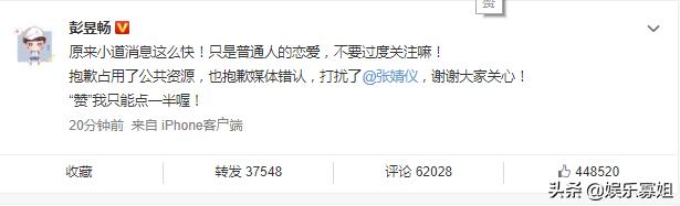 4月23日,彭昱畅在社交平台上发文澄清与新生代小花张婧仪的恋爱,表示:“原来小道消息这么快!只是普通人的恋爱,不要过度关注嘛!“赞”我只能点一半喔! ”此前彭彭曾在节目中表示如果恋情被拍到了就点个赞,另外他还表示女方不是演员@张婧仪 。恭喜彭彭结果单身生活!