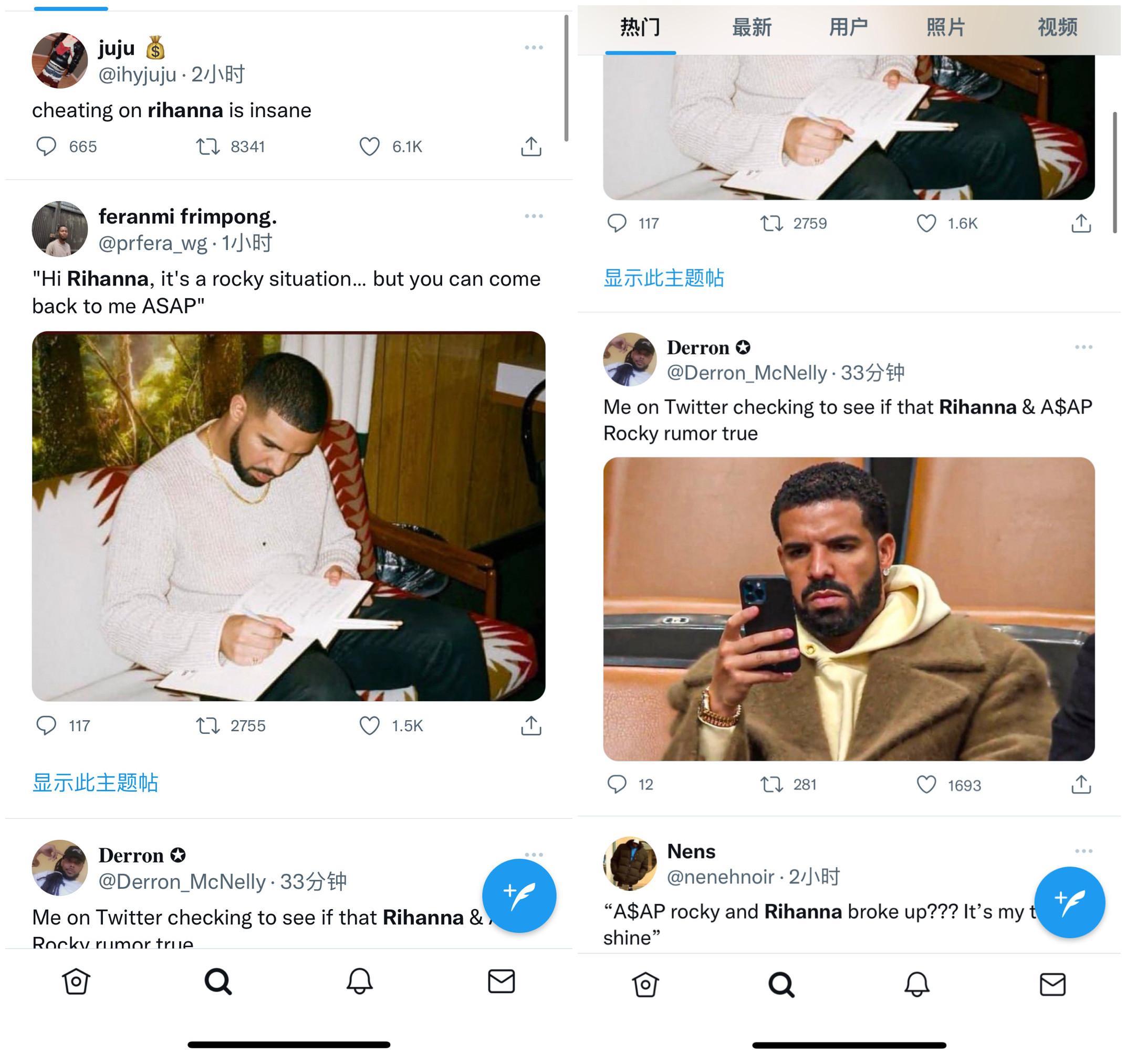 根据相关消息透露,这次分手的原因居然是在巴黎时装周期间A$AP Rocky出轨了设计师 Amina Muaddi。事情发酵之后,网友们却在cue当红说唱界当红炸子鸡drake,希望两人可以走到一起。不过这也只是网友们的调侃罢了,Rihanna和drake两人已经是多年的合作伙伴,合作的歌曲也成为经典,当时两人都没走到一起,更何况现在呢?