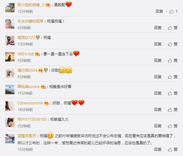 网友们也都纷纷留言为这一对小情侣送去了祝福:“看起来很般配 一定要幸福哦”“祝福祝福”“祝福 之前付辛博接受采访时说过不会公布恋情,现在看来应该是真的要结婚了,所以才公布的,这样一来,感觉最近传闻的颖儿已经怀孕的消息,应该也是真的了。”