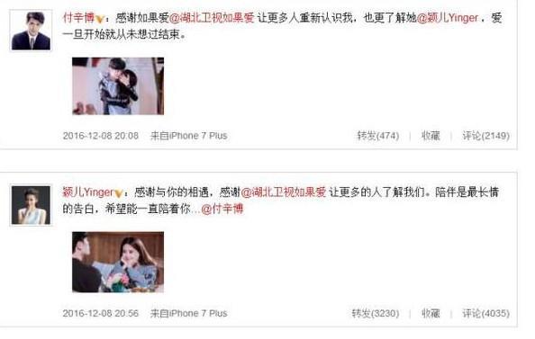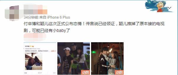 感受到两人的甜蜜暴击后,有网友就在微博发文称:“付辛博和颖儿这次正式公布恋情!传言说已经领证,颖儿推掉了原本接的电视剧,可能已经有小baby了。”